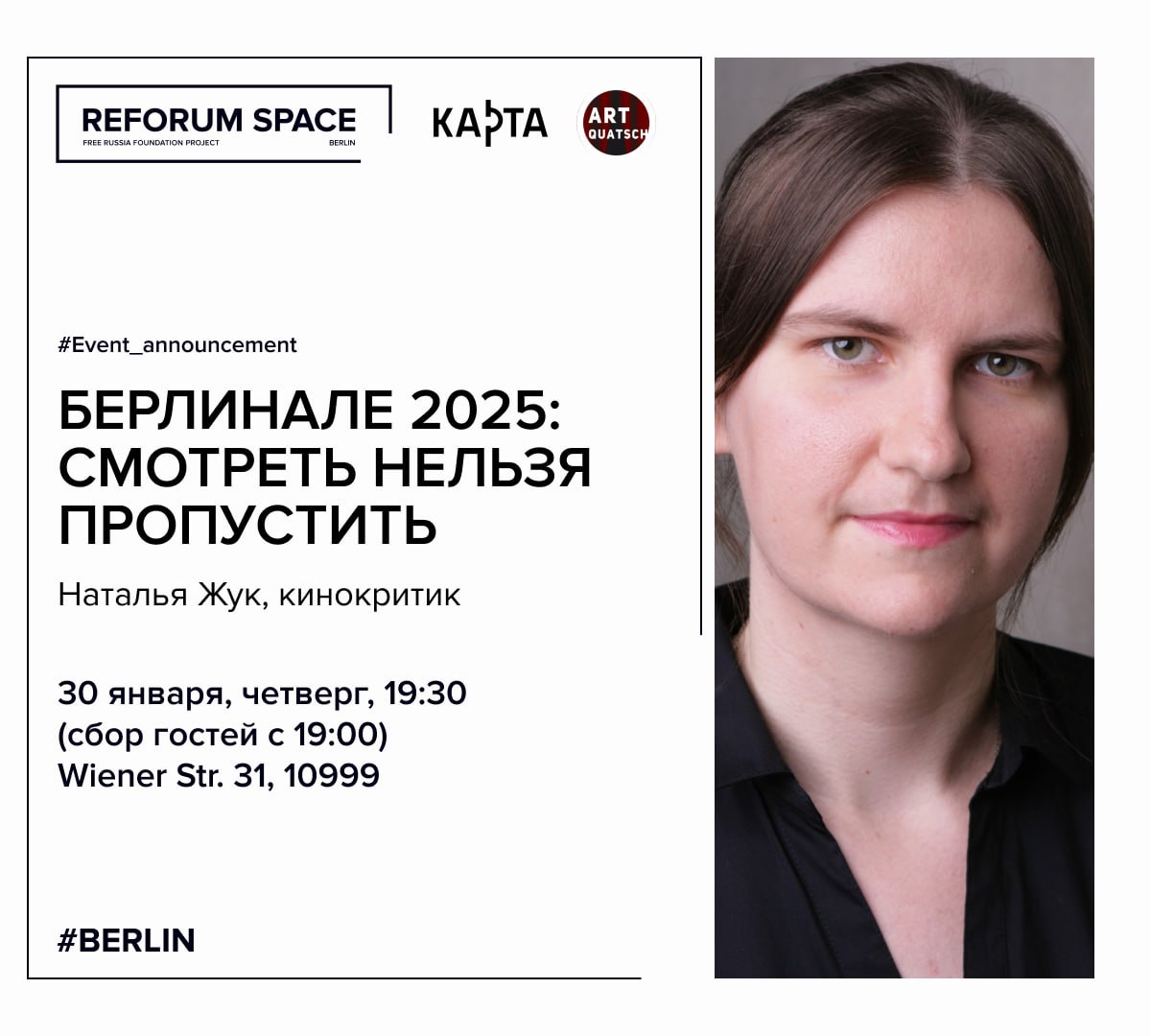 Наталья Жук — кино- и театральный критик, более десяти лет пишущая для СМИ, среди которых берлинские «Живой Берлин» и Karta.Media, киевский «Мувиграм», лондонский “The Telegraph” и др. Наталья — завсегдатай пресс-показов и пресс-конференций Берлинале, Венецианского, Каннского, Лондонского кинофестивалей. О кино и театре рассказывает в своем проекте artquatsch и в Fb-группе «Artquatsch world: в театр и в кино с Жуком-Летописцем». Берлинале-2025 станет седьмым подряд Берлинале для Натальи.