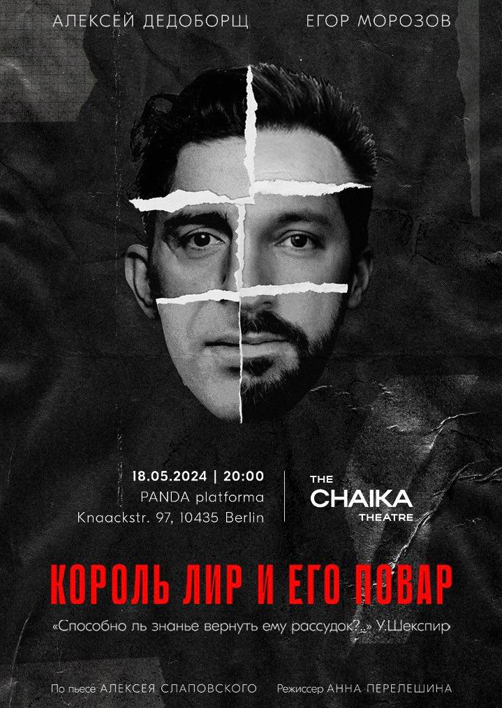 «Король Лир и его Повар» — спектакль на русском языке, основанный на пьесе Алексея Слаповского. Это продолжение пьесы Шекспира, в котором актеры Алексей Дедоборщ и Егор Морозов представляют захватывающую историю о короле Лире, оказавшемся в чистилище после своей смерти, в компании с незнакомцем-поваром. Спектакль задает зрителям непростые вопросы о тирании, мечтах, создании правителей и о праве на убийство тиранических правителей. Пьеса, написанная в 2021 году, содержит чувствительные параллели с современной реальностью.