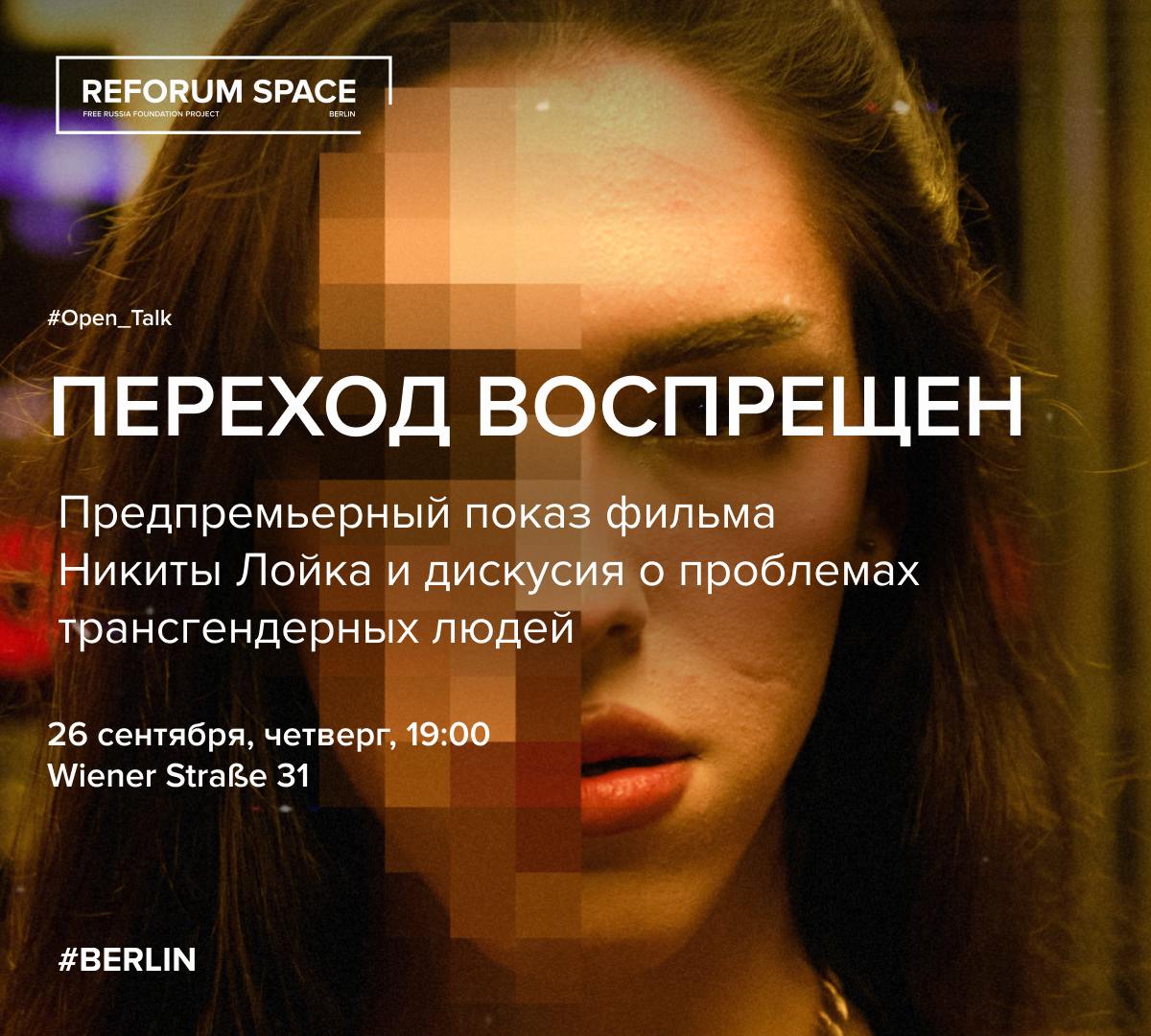 Предпремьерный эксклюзивный показ документального фильма «Переход воспрещен». После показа состоится дискуссия о правах и проблемах трансгендерных персон.