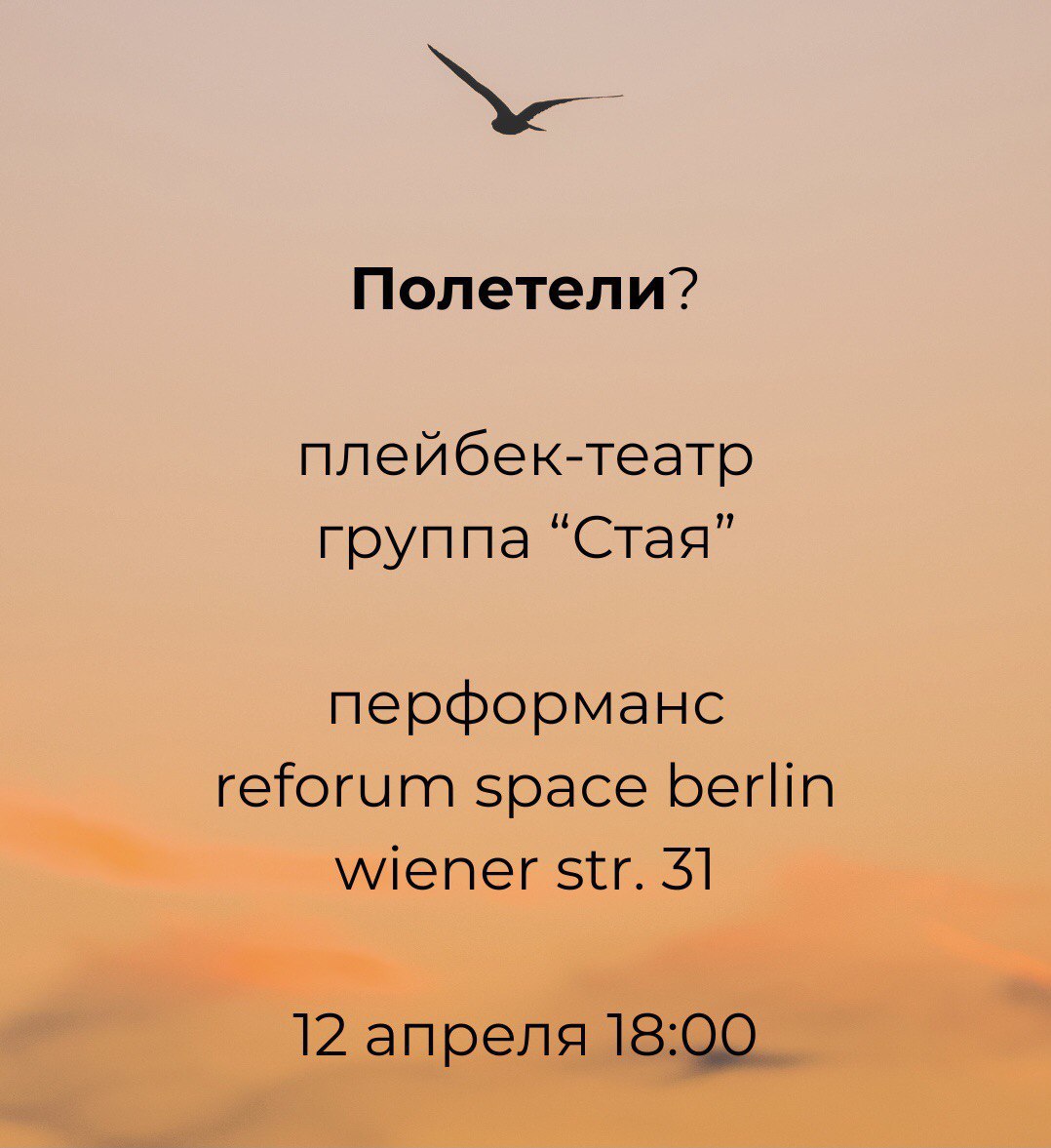 В рамках перформанса вспомним и проживем ваши личные истории, связанные с полётом, началом, развитием — попробуем взлететь с вами вместе! Будем рады прожить истории, рассказнные на русском или украинском языках.