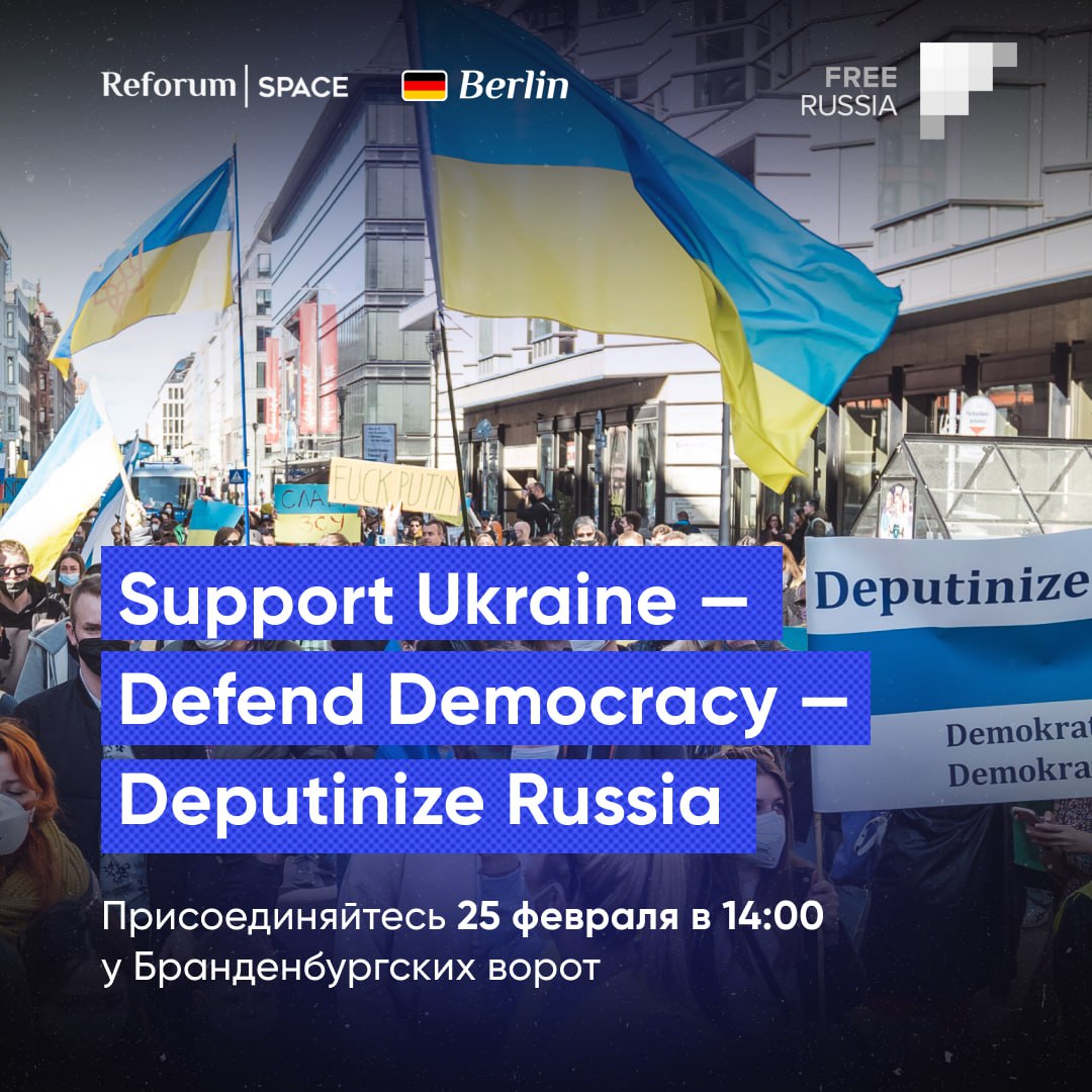 Мы, антивоенные демократические россияне и россиянки, призываем вас выйти 25 февраля в 14:00 к Бранденбургским воротам, чтобы заявить: