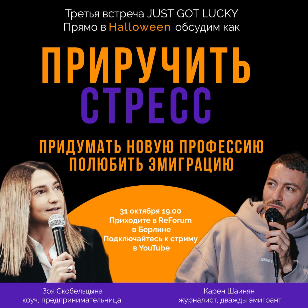 Встреча, чтобы поговорить о стрессе, новых профессиях и жизни в эмиграции на третьей встрече Just Got Lucky с Кареном Шаиняном и Зоей Скобельцыной.