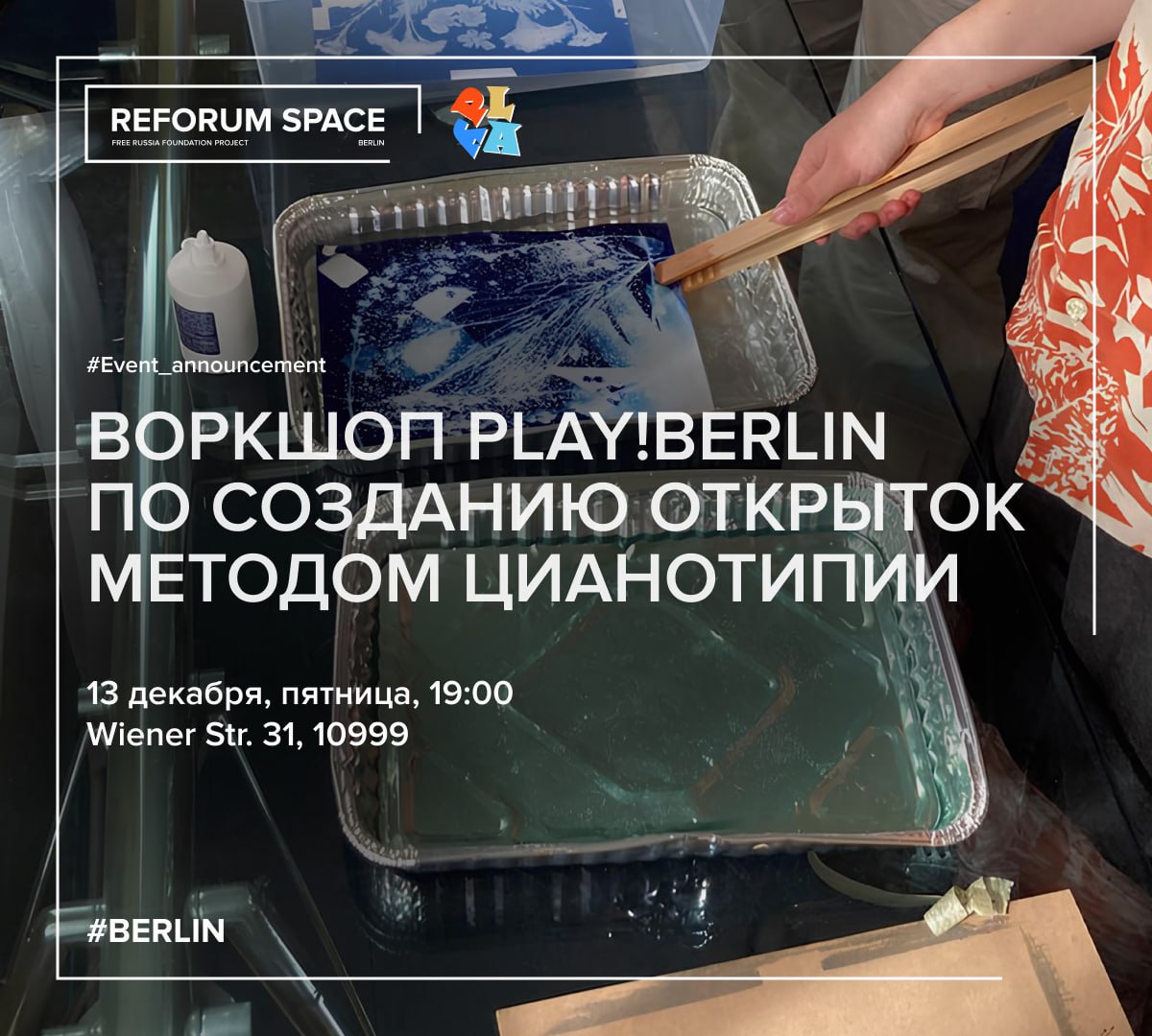 В эту пятницу участницы Play!Berlin поделятся опытом своей работы, планами на будущее и проведут художественный воркшоп по ручной печати открыток методом цианотипии. Цианотипия — это аналоговый фотопроцесс, который на отпечатках дает ярко-синий цвет, который еще называют берлинской лазурью.